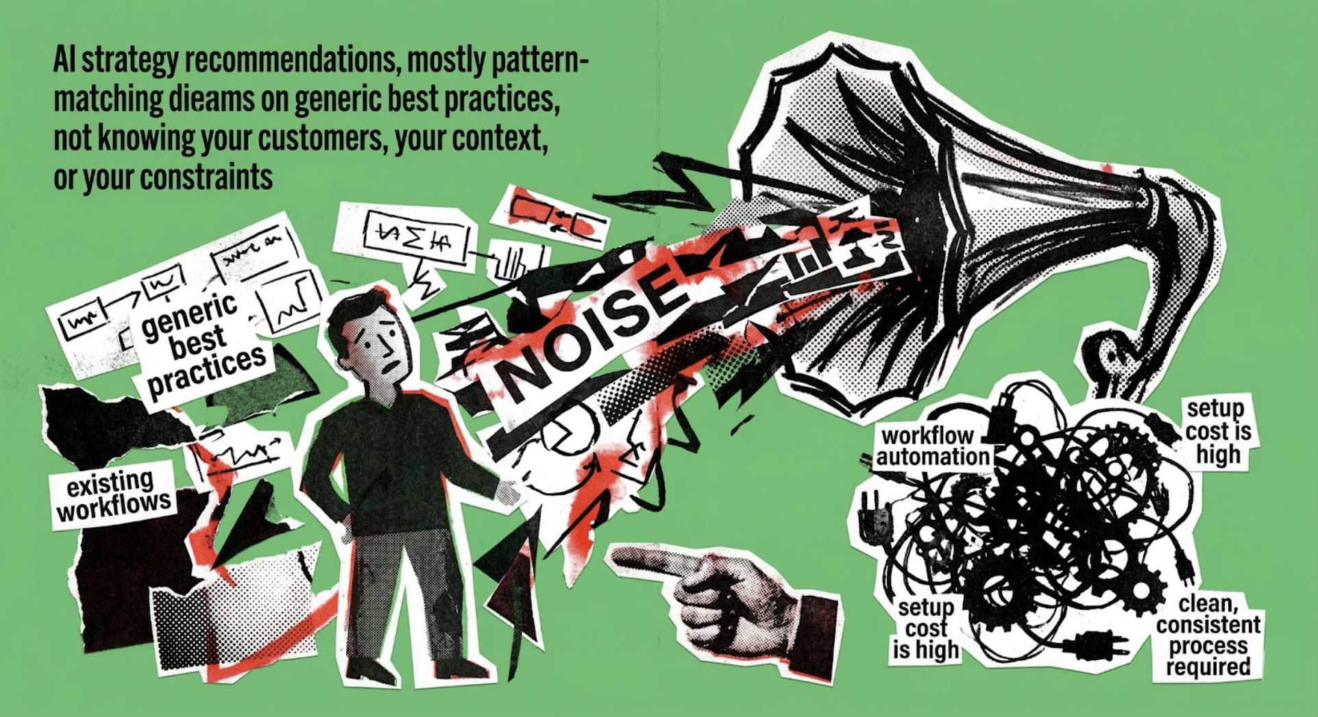 AI-generated strategy recommendations are the big one. Tools that claim to analyze your business and tell you what to do are mostly pattern-matching on generic best practices. They don’t know your customers, your context, or your constraints. They sound authoritative. Be skeptical.