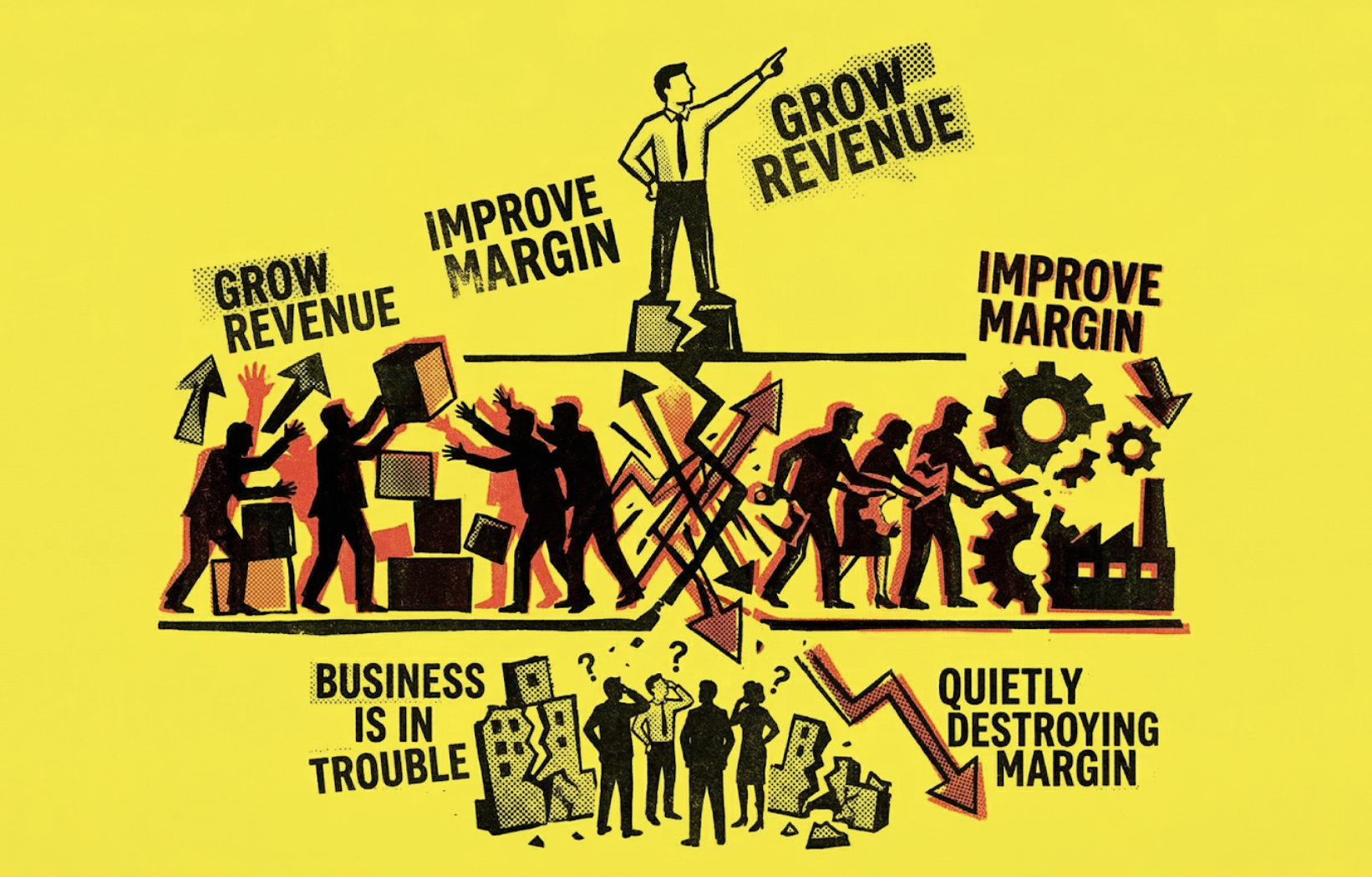 But as that goal moves down through the organization, it gets interpreted differently at each level. The sales team hears “grow revenue” and focuses on volume. More deals. More discounts if needed. The operations team hears “improve margin” and focuses on cutting inputs. Both teams are rational. Both teams are working hard.